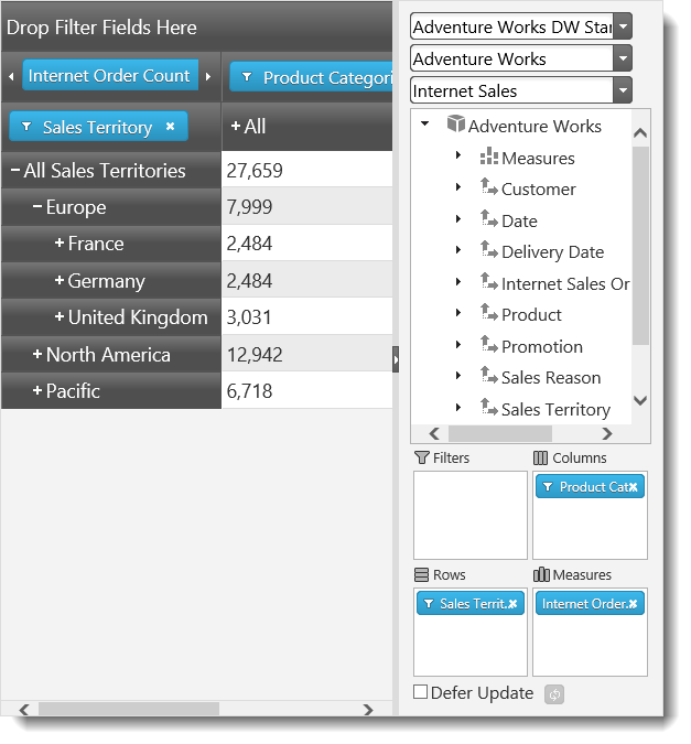 The igPivotGrid control is a data presentation control for displaying data in a pivot table. It enables users to perform complex analysis on the supplied data. The igPivotGrid uses the Online Analytical Processing (OLAP) approach to present the results of multi-dimensional queries in an easy to comprehend manner. The igPivotGrid control uses an instance of either igOlapFlatDataSource™ or igOlapXmlaDataSource™ component as data source.
