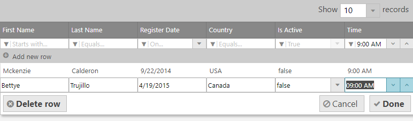 A new column type is added to the igGrid control - time column. In order to use it, it is necessary to set the column dataType to time. In this way, you can filter and update time data using the build-in time picker editor.