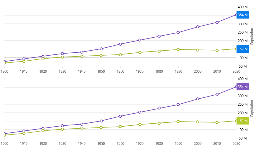 Callouts Layer is a new feature of Data Chart that you can use to annotate important data points or display their values. Callouts Layer can target multiple data series or individual data series. Also, you can customize appearance of these callout layers and bind callout labels to data items or calculate changes between consecutive data points.