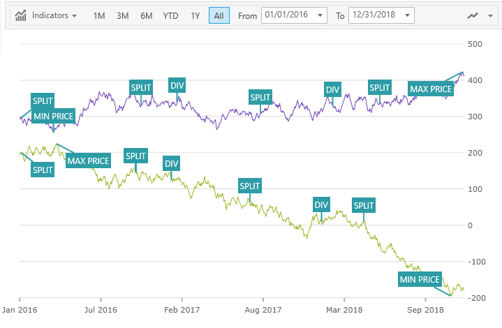 With the Callouts Annotation, you can annotate important data points in Financial Chart or even customize values in callout boxes based on your logic. For example, show stock split, dividends, or calculate maximum price in your data source.