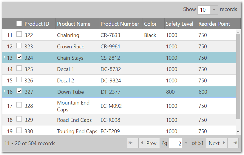 | Selection checkboxes | Determines whether the row selectors column should contain checkboxes | enableCheckBoxes |
