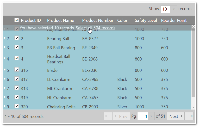 Note: "Select All" functionality does not work for remote Paging. Clicking on the header checkbox will only select the rows from the current page.