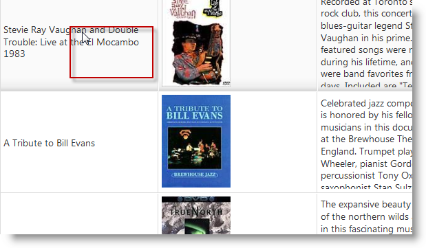 In this example, the tooltips are configured to display over every column that contains text and not over the columns that store images.