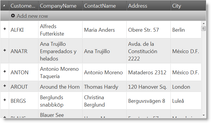 The igHierarchicalGrid will be configured to use REST service which exposes data from the Customers and Orders tables of the Northwind database.