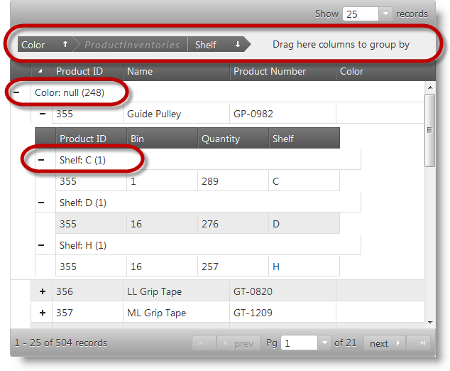 The grouping functionality available for flat grids is now fully supported for hierarchical grids. It allows flexible grouping of rows based on one or more columns, calculation of summary values (subtotals) and configuring UI elements like expand/collapse button tooltips, group header row template and others. On the screenshot below you can see highlighted the main elements of the GroupBy feature: the grouping area at the top, and group header rows on root and child level. Note how grouped columns in child layouts are prefixed by the child layout name in the group-by area.