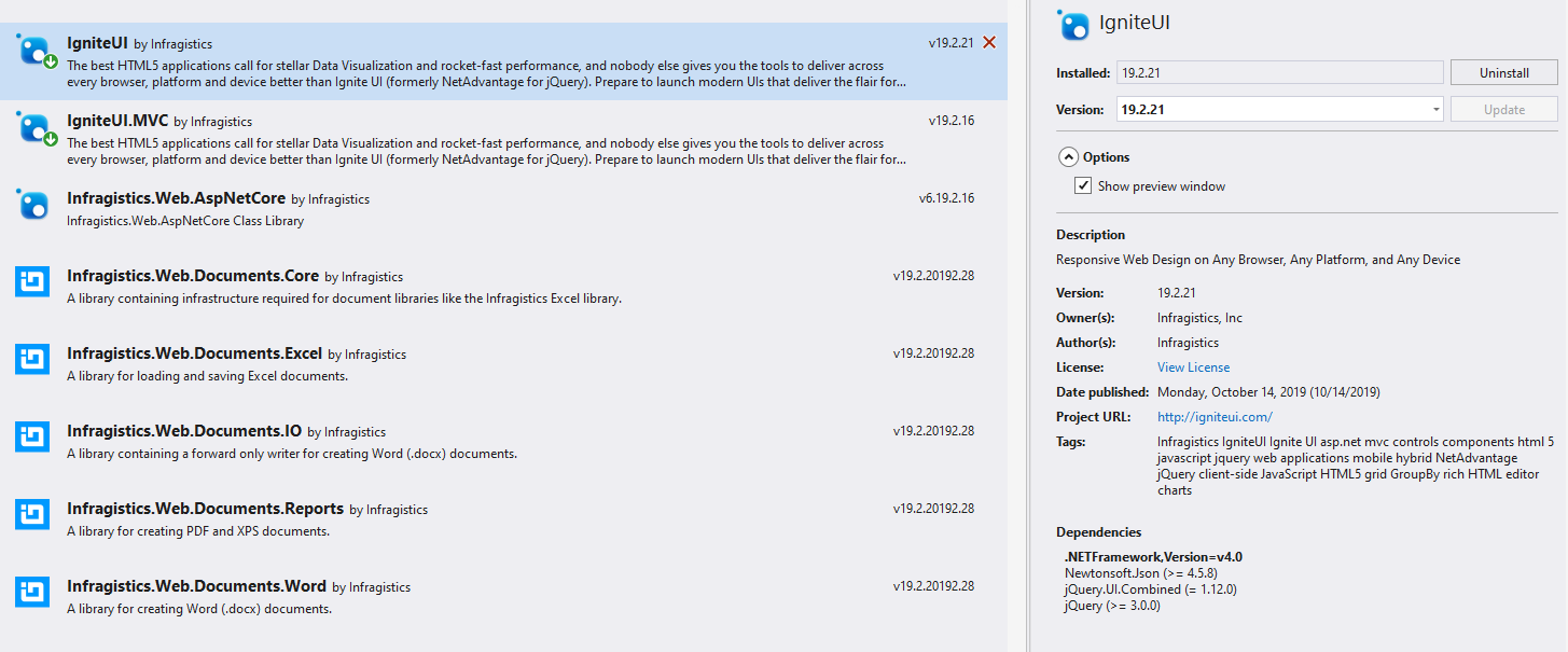 Infragistics Ignite UI for jQuery controls are available to explore as a NuGet package and this is the easiest and the fastest way to install the Infragistics files and assemblies required for your project. There are two approaches to start using the NuGet packages. We suggest you to set up and use our private NuGet feed hosted on https://packages.infragistics.com/nuget/licensed which will keep you up to date with all the NuGet packages Infragistics provide. Using this approach you will be able to get the latest version of the packages each time you create a new project or restore the packages of an existing one.