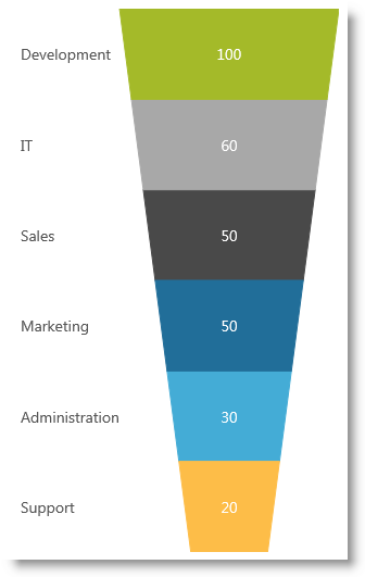 The igFunnelChart is a data-bound control which displays data in sorted amounts to show the relationship between sizes of category data. The chart supports tooltips, Bezier curves, selection, a chart legend, and a full range of visual customization.
