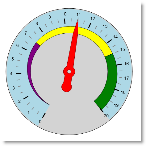 The igRadialGauge™ control represents a range of values arranged in a circular fashion. The igRadialGauge control usually contains one or more scales that represent a specific range of values. The needles then move along the scale to indicate values.
