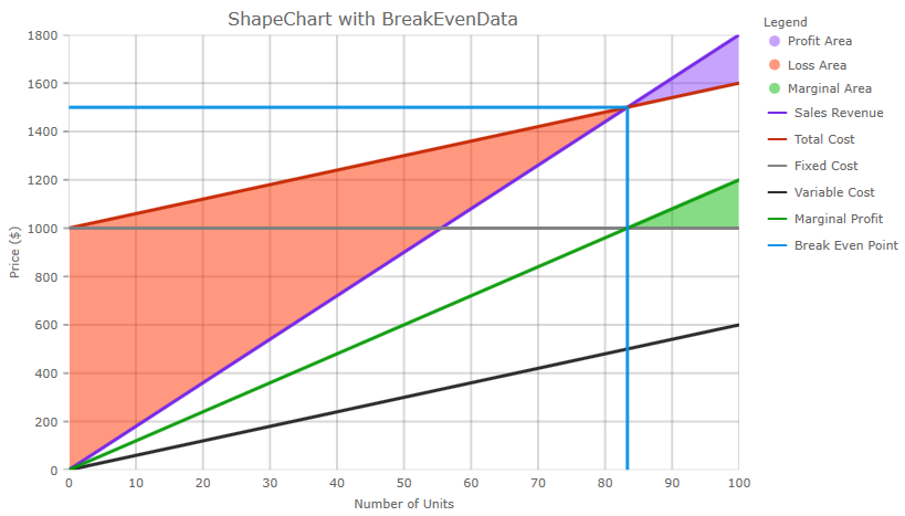 In addition, this chart can render break-even data as long as at least one data item has FixedCost, VariableCost, SalesRevenue, and SalesUnits data columns.