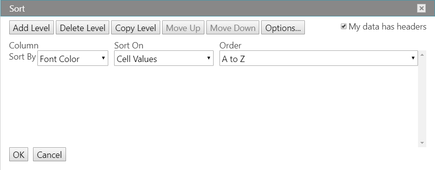 Since sorting is so important in any Excel document, we added the very useful Custom Sort Dialog to give you full control over how you want to sort your Excel data. For example, if you have a Department column and an Employee column, you can first sort by Department (to group all the employees in the same department together), and then sort by name (to put the names in alphabetical order within each department).