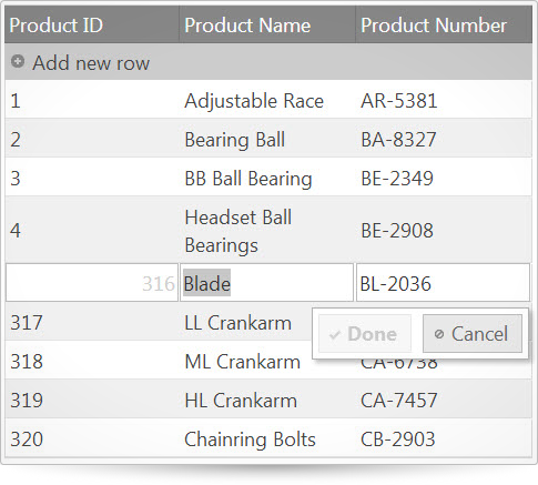 Both the igGrid and igHierarchicalGrid controls feature data updating in the grid. The updating features of the grid provide a wide array of adding and editing values of the underling set of data bound to the grid. Further information regarding the classes, options, events, methods and themes of this API are available under the associated tabs above.