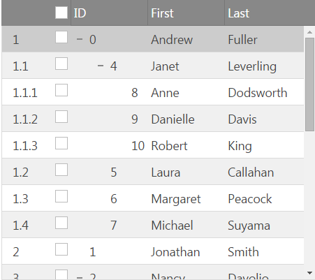 - Checkboxes are rendered and support two states(checked and unchecked). Checkboxes do not cascade down or up in this mode.