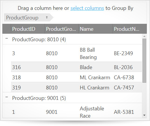 Both the igGrid and igHierarchicalGrid controls feature column grouping in the grid. The grouping feature allows users to group rows of data in the grid by common column values. Further information regarding the classes, options, events, methods and themes of this API are available under the associated tabs above.