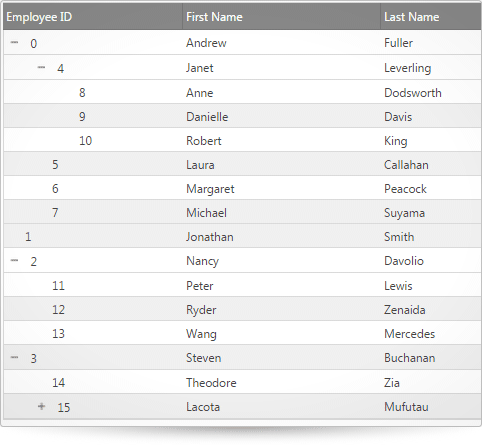 The igTreeGrid™ presents hierarchical data by combining the principles of a tree and tabular data into a single control. Inside the igTreeGrid hierarchical data is rendered using the same columns for each row while providing a way for users to expand and collapse child data.