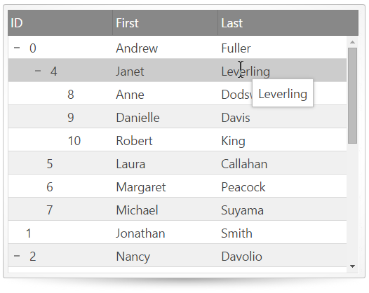 The igTreeGrid includes a Tooltips feature which allows tooltips to appear when the user hovers the mouse pointer over a grid cell. Tooltips are configurable to adjust duration and visibility options. Further information regarding the classes, options, events, methods and themes of this API are available under the associated tabs above.