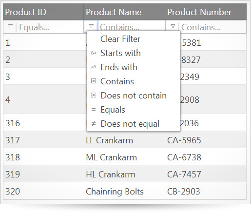 Both the igGrid and igHierarchicalGrid controls feature row filtering which allows users to restrict grid rows to only the data that meets a given criteria. Filtering options include numeric, string and date filters. Further information regarding the classes, options, events, methods and themes of this API are available under the associated tabs above.