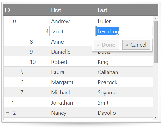 - Classes applied to the Row Edit Dialog's Done and Cancel buttons.