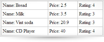 $($.ig.tmpl("<tr><td>Name: ${name}</td><td>Price: ${price}</td><td>Rating: ${rating}</td></tr>", ds.dataView())).appendTo("#table1");