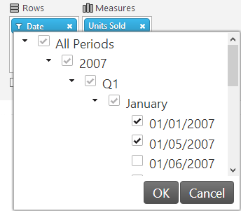 rows: "[Date].[Date]{ [Date].[Date].[SaleDateDay].&[All Periods]&[2007]&[Q 1]&[January]&[Jan 1], [Date].[Date].[SaleDateDay].&[All Periods]&[2007]&[Q 1]&[January]&[Jan 5]}",