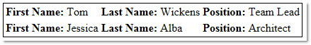 var template = '<tr><td><b>First Name: </b>${personal.firstName}</td>' + '<td><b>Last Name: </b>${personal.lastName}</td>' + '<td><b>Position: </b>${position}</td></tr>';</script>