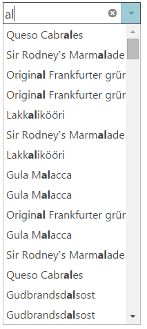 The igCombo auto-suggest feature is the combination of drop-down list filtering and match-highlighting to suggest possible choices to the user. Setting the filteringType to ‘local’ enables list filtering and setting highlightMatchesMode allows for matching text in the dropdown to be highlighted.