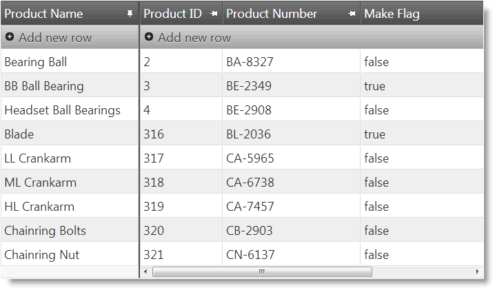 When Updating is enabled in combination with Column Fixing, there are two separate Add new row buttons, one for the Fixed Columns area and one for the Non-Fixed Columns area, respectively.