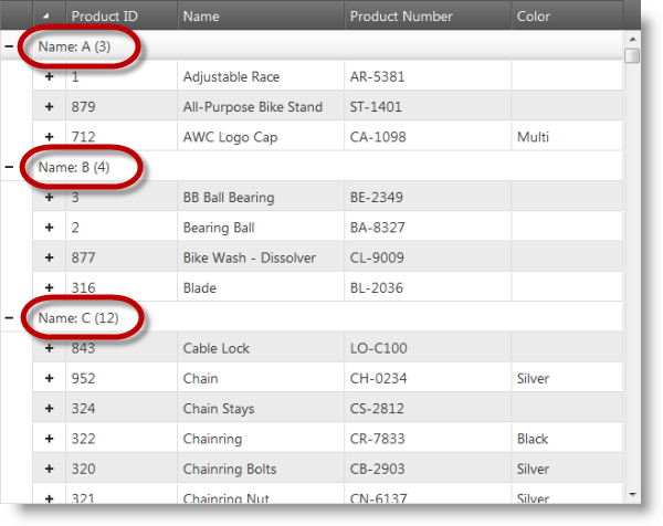 As with the previous JavaScript example, here, the method call GroupByComparerFunction("firstLetterGroupComparer") of the grid wrapper configures the grid to use the firstLetterGroupComparer() function for grouping on the Name column.