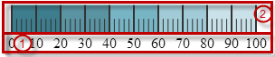 • Graph area (2) – The area for displaying the needle, the tick marks, the ranges, and, optionally, the numbering labels of the linear gauge. All extent-related properties for these visual elements (except for labels) are measured against its edges. The Graph area serves not as a placeholder but as a frame of reference for positioning the scale inside the control (More precisely, for positioning the visual elements of the scale).