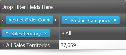 Any of the hierarchies of the data source can be used as columns, rows, or filters in the igPivotGrid. Data source measures are used to for displaying the corresponding numeric values. Users can move the present hierarchies between rows and columns by drag-and-drop. They can also specify the exact place of a hierarchy or measure in its area.