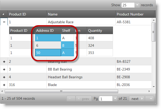 The selection feature enables the selection of the rows and cells in the igHierarchicalGrid™ control. Its functionality closely follows the Microsoft® Windows Explorer™ and Microsoft® Excel™ selection and activation behaviors. It is possible to configure single only or multiple item selection. If multiple selection is enabled in a hierarchical grid the user can select multiple items in a single layout only. On the screenshot below you can see a hierarchical grid with some selected cells.