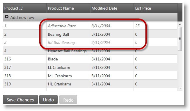The grid editing functionality has been improved to report only net transactions from the grid control when data is updated, added or deleted. That means transactions which mutually cancel each other will not be reported and the client applications will get only the effective changes on the underlying data. For example. If a row is added and then deleted neither insert, nor delete transaction will be reported. On the picture below you can see a grid with an updated and deleted row.