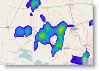 Visualizes colored geographic area based on triangular irregular networks (TINs) defined in a triangulated (ITF) file or other custom triangulation data source. Geographic coordinates and a value member are also needed. This can be used to depict terrain elevation, population density, average/current temperature and others.