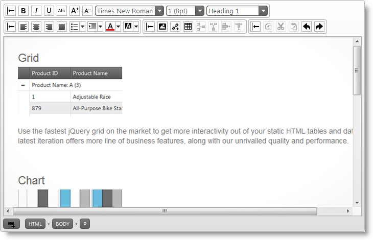 The igHtmlEditor control is a jQuery HTML editor control that features standard HTML editing capabilities. Formatting options include font face, font size, text and image alignment and link and table support. Further information regarding the classes, options, events, methods and themes of this API are available under the associated tabs above.