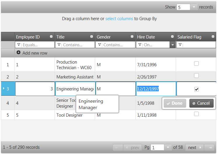 DataTable and DataSet binding for igGrid and igHierarchicalGrid: Binding to a DataTable or DataSet is available for the igGrid and igHierarchicalGrid